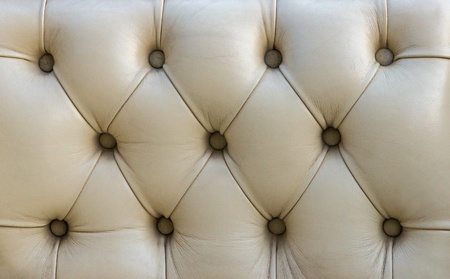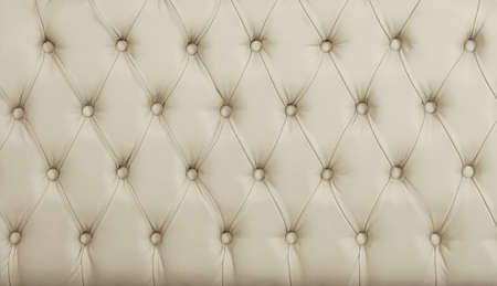 Close up background texture of beige white capitone genuine leather, retro Chesterfield style soft tufted furniture upholstery with deep diamond pattern and buttons