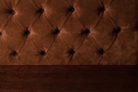 Empty wooden table with blur vintage sofa background.