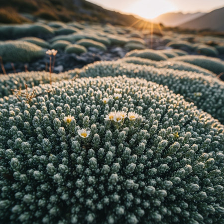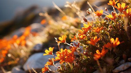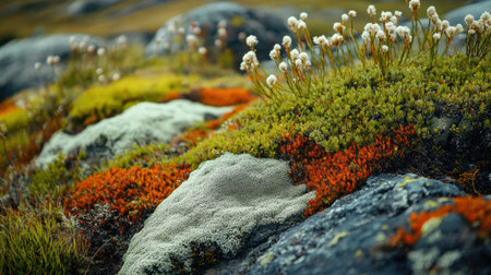 Lush patches of colorful moss and lichen cover the rugged rocks, creating a vibrant landscape. Delicate flowers blossom, adding beauty to the serene outdoor scene.