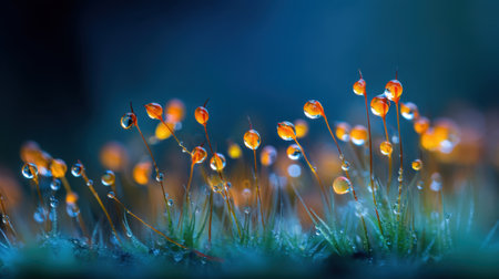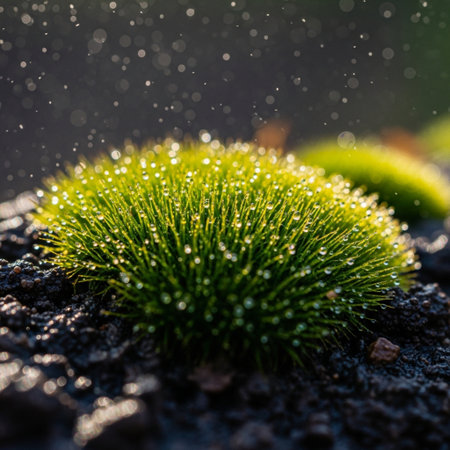 This enchanting close-up image captures vibrant moss adorned with dew drops, radiating a magical glow in a serene natural setting.