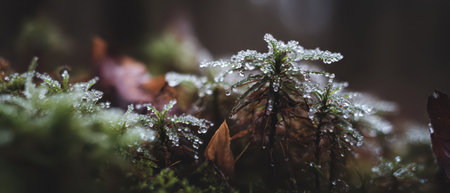 Delicate dewdrops cling to mossy plants in a serene forest setting celebrating the start of a fresh New Year amidst natures beauty.