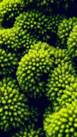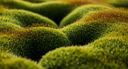An extreme macro photograph of lush, green cushion moss, forming soft, undulating mounds. Tiny dew drops or water droplets cling to the tips of the moss, sparkling in the light and highlighting its delicate, velvety texture. This beautiful nature abstract creates a serene and miniature landscape.