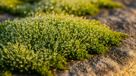 Captivating close-up view of vibrant green moss thriving on rough stone, illuminated by gentle light, creating a serene and peaceful natural landscape ambiance.