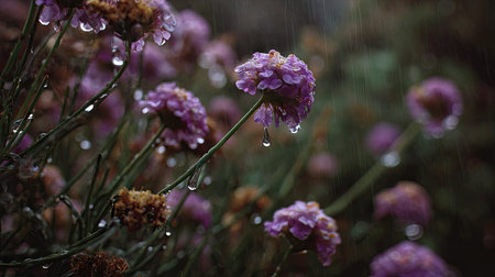 Soft rain falling gently on Statice, with water droplets forming and slowly dripping. The background is softly blurred with a natural, moody atmosphere.