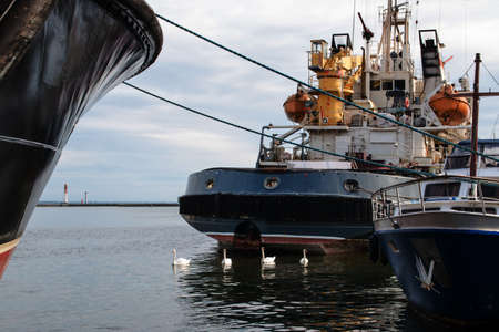 Tugs in the port. Ships at anchor. Batumi port. Escort ships. sea harbor