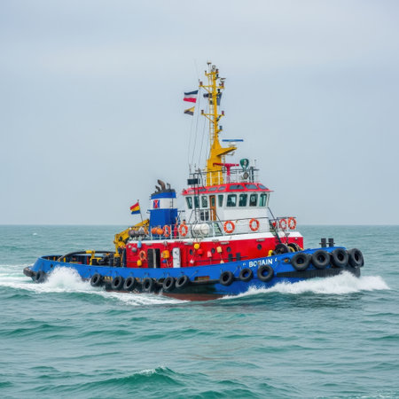 A brightly colored tugboat navigates the sea, adorned with numerous flags. The vessel cuts through the water, creating a foamy wake against a backdrop of clouds.