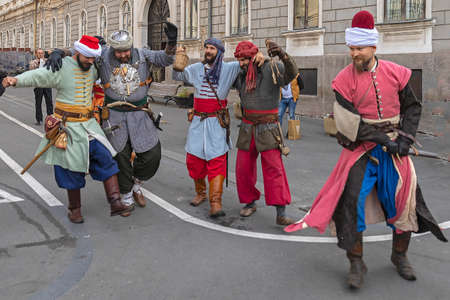 TIMISOARA, ROMANIA - SEPTEMBER 28, 2019: Men dressed in Turkish medieval infantry soldiers with uniform and dancing on the street, during the Days of hungarian culture, organized by the City Hall.