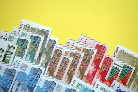 Pakistan rupees banknotes on yellow background. The current Pakistan money bills lies on table in big amount. The concept of business and investment in Pakistan