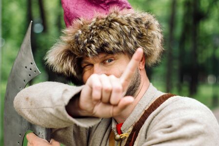 City Cossack 1st half of the 17th century. In a caftan, a fur hat in the hands of birding. A man from the time of Boris Godunov, Russian history. Tricky glance. Horizontal photo. Shows a finger.