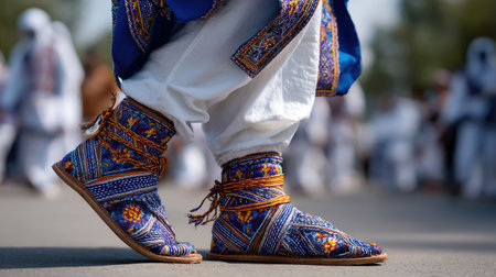 A man wearing blue and white clothing with a blue and white patterned shoe. The shoe is decorated with beads and has a blue and white pattern