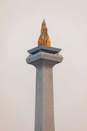 Jakarta, Indonesia - July 13, 2019: Close-up of the obelisk of the National Monument in Central Jakarta, Merdeka Square, with its golden flame, symbol of Indonesian freedom.