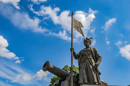Kharkiv, Ukraine - July 20, 2020: The bronze statue of the great otaman Ivan Sirko in Kharkov against a blue cloudy sky closeup. Zaporizhzhia Army’s outstanding military leader monument with a cannon