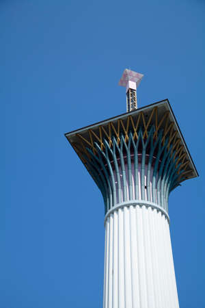 Totem column on the central square in Yalong Bay. Beautiful view from the height of the city, the beach and the sea. Sanya City, Hainan Island, China.