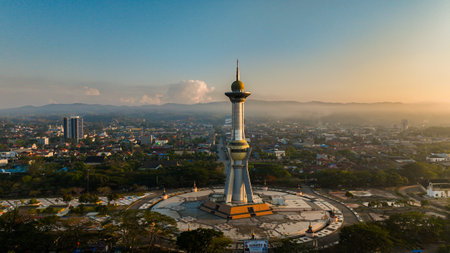 Aerial photo of monument which is one of the icons in Kendari, Southeast Sulawesi, Indonesia. Panoramic view around the monument with residential and urban background at dusk