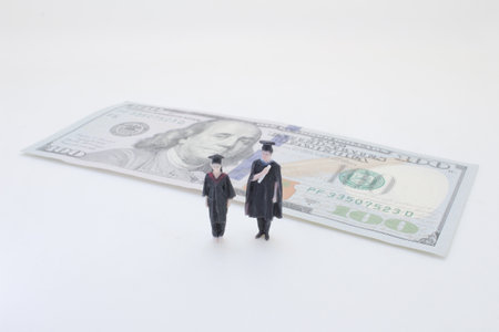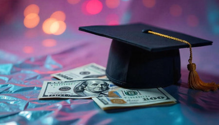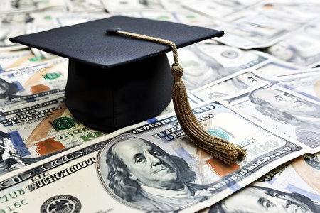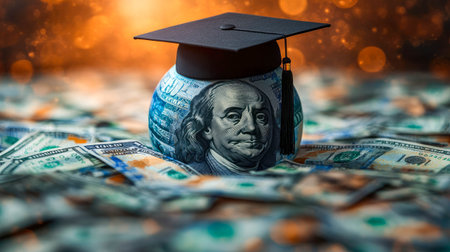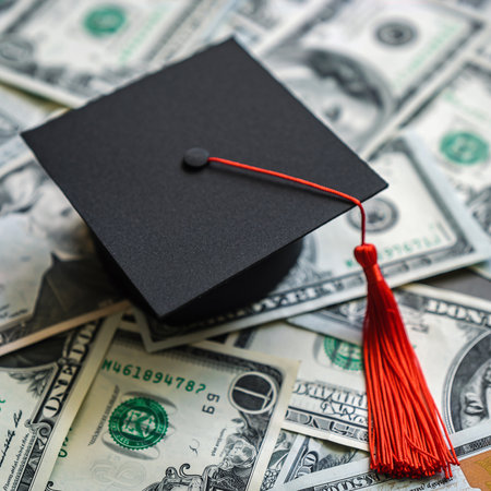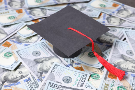 A graduation cap with a red tassel lies on a pile of US dollar bills. Clear details and vibrant colors enhanc...