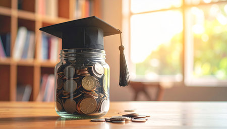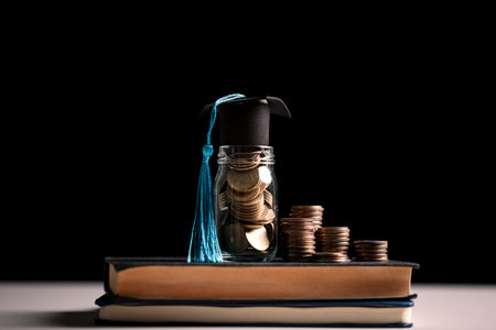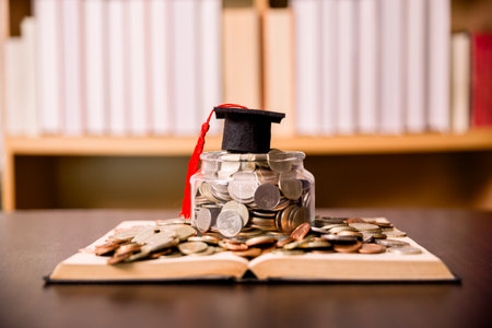 Glass jar of coins on an open book with a graduation cap and red tassel, symbolizing education savings, tuition costs, scholarships and smart student budgeting in a library setting.
