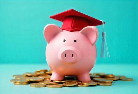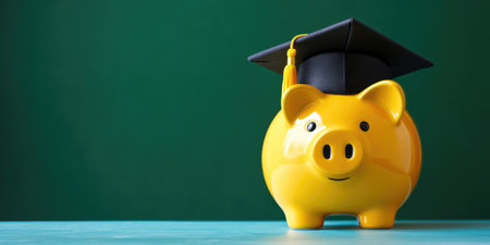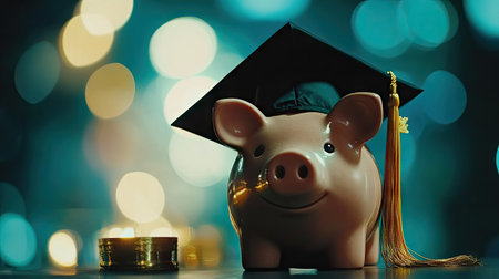 Graduation-capped piggy bank sitting on a table with graduation tassels, signifying college savings and planning for the future.
