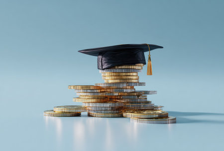A miniature graduation cap rests on a tower of coins, suggesting themes of education and economics. The composition displays a mix of metallic and muted blue tones, presenting a modern, clean aesthetic. This image is suitable for illustrating financial literacy, educational investments, or related editorial or commercial projects.