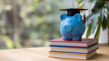Blue piggy bank wearing graduation cap on stacked books, symbolizing education and financial goals.