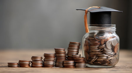 Coins stacked in various heights next to jar filled with coins, topped with graduation cap, symbolizing education savings and financial planning for future studies