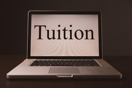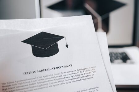 Tuition fee or student loan with calculator. Education price , savings fund college, and expenses concept. Money and papers on table. Calculating budget and planning finance.
