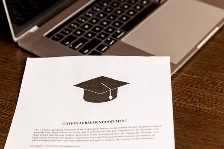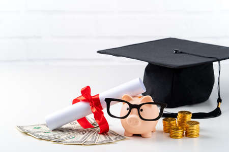 Graduate hat and dollars on table. Tuition payment