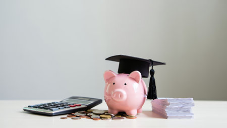 A pink piggy bank wearing a graduation cap sits on a table surrounded by coins and a calculator, symbolizing financial planning and education, with stacks of paper nearby