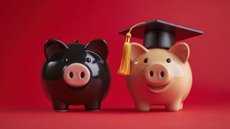 Two piggy banks, one wearing a graduation cap, against a red backdrop. A visual metaphor for education funding and savings.