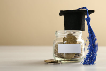 Scholarship. Jar with graduate hat and coins on white wooden table, closeup. Space for text