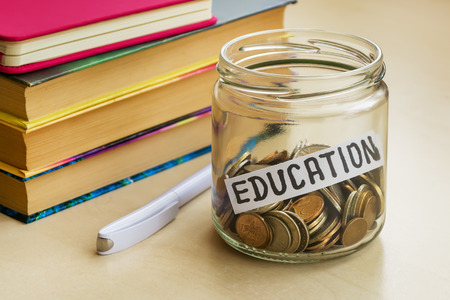 Glass jar with a lot of coins and education word near white ballpoint pen and few books on a table. Saving money for education concept. Planning for future expenses and to make targeted savings.