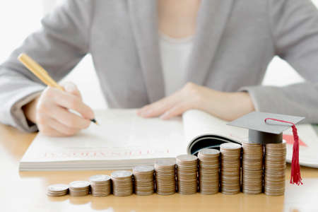 Saving money coin with banking investment, finance education concept. Planning student loan for studying abroad for college or university degree. Future children's education fund cash. Growing saving