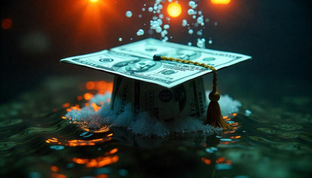 Graduation cap made of money rising out of water