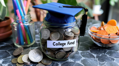 A decorative savings jar labeled College Fund with a graduation cap, filled with coins, sits on a stylish table alongside colorful pens, symbolizing education savings.