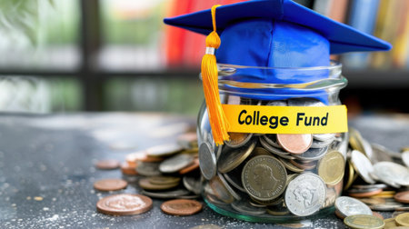 A glass jar filled with coins, labeled College Fund, topped with a graduation cap symbolizes savings and financial planning for education costs.