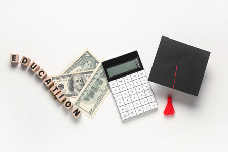 Graduation hat with money and calculator on white background. Tuition fees concept