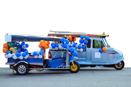 Tuk Tuk Thailand adorned with balloons on white