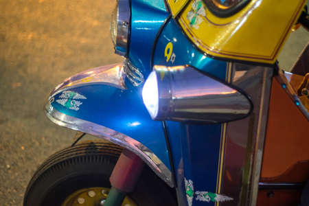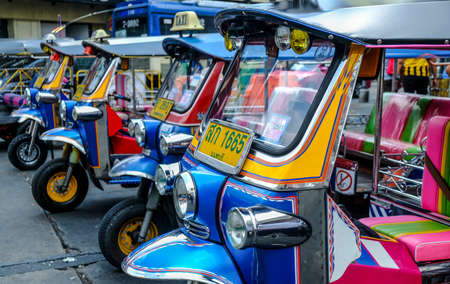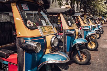 Bangkok, Thailand - November 18, 2017 : Tuk Tuk taxi of Thailand are parking for wait a tourist passenger at Khao San Road, Khao San road is a famous place for sight-seeing and enjoys eating in the night of Bangkok.