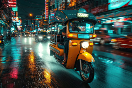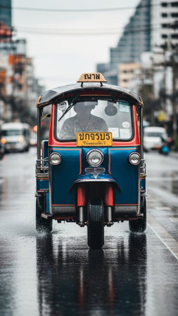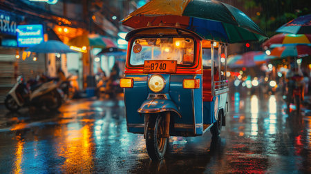 A vibrant tuk-tuk navigates through a rain-soaked city street at night, creating a vivid contrast against the wet pavement, illuminated by street lights.