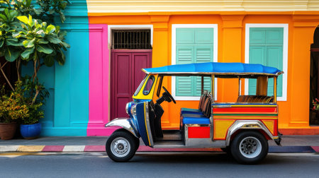 A vivid tuk tuk stands parked beside a strikingly colorful building, showcasing vibrant hues and lively architecture, perfect for travel and culture lovers.