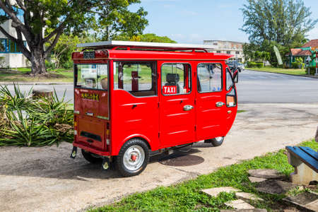 Bridgetown, Barbados - December 18, 2016: Local red taxi wait for passengers in Bridgetown, Barbados, West Indies, Caribbean.