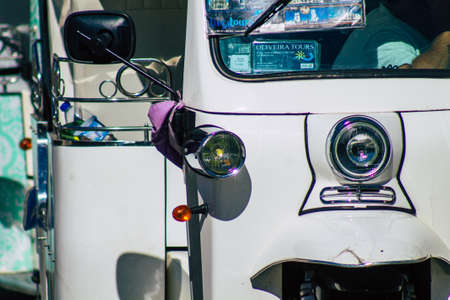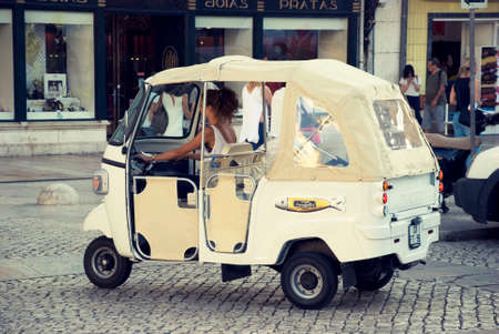 White tuk tuk as a taxi for tourists in downtown Lisbon, Portugal