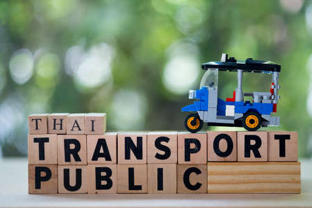 Tuk tuk Thailand traditional taxi on wooden block words of Thai transport public with nature background