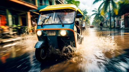 Tuk tuk driving through flooded street in tropical area. Generative AI.