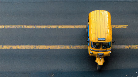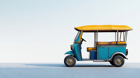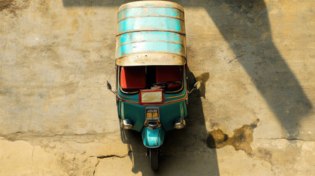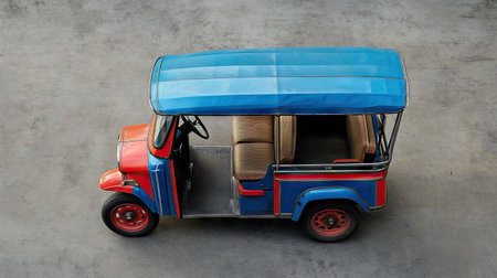 Top view of a tuk tuk with its distinctive features, set against a neutral background, creating ample space for copy or logos.
