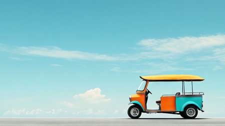 Side view of a tuk tuk with a clear sky above, providing ample space on the right side for text or promotional material.