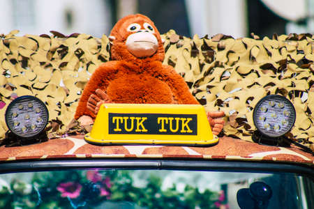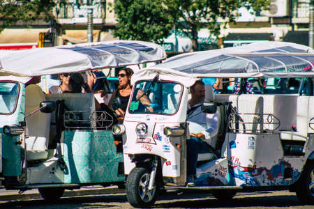 Lisbon Portugal August 01, 2020 View of a tuk tuk for tourists driving through the streets of Lisbon, the hilly coastal capital city of Portugal and one of the oldest cities in Europe
