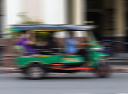 Blurring Thai tuk tuk movement is rapidly moving passengers on the city streets.