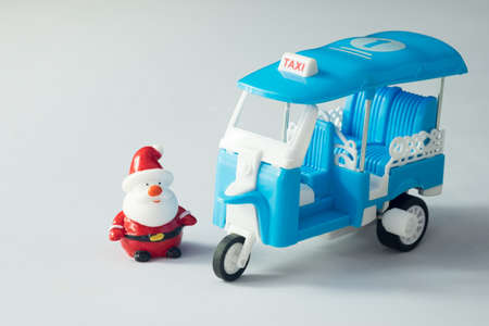 Santa Clause in red suit looking blue three-wheel taxi or tuk tuk for transportation