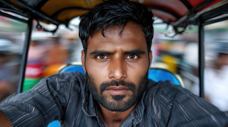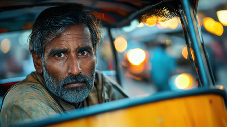 New Delhi, Delhi, India. Auto Rickshaw Tuk tuk driver waiting next passengers clients in busy street