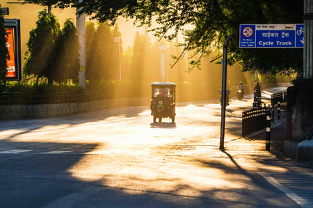 Beautiful yellow sun rays touching the empty road of raipur, an electrical auto rishaw passing in empty road at morning and sunlight crossing through trees, scenary, beauty of raipur, chhattisgarh